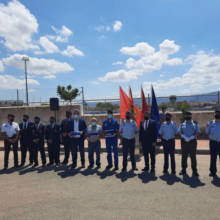 El alcalde de Alcantarilla, Joaquín Buendía, acompañado por el coronel jefe de la Base Aérea de Alcantarilla, José Alberto Llopis y el capitán jefe de la PAPEA, José Luis Lomas, el presidente del club Jairis, Salvador Costa y uno de los directivos fundadores del club Nueva Vanguardia, Fulgencio Izquierdo, descubrieron hoy las tres placas que dan nombre a las calles, tras la exhibición de la PAPEA, con un salto paracaidista sobre el polideportivo municipal.